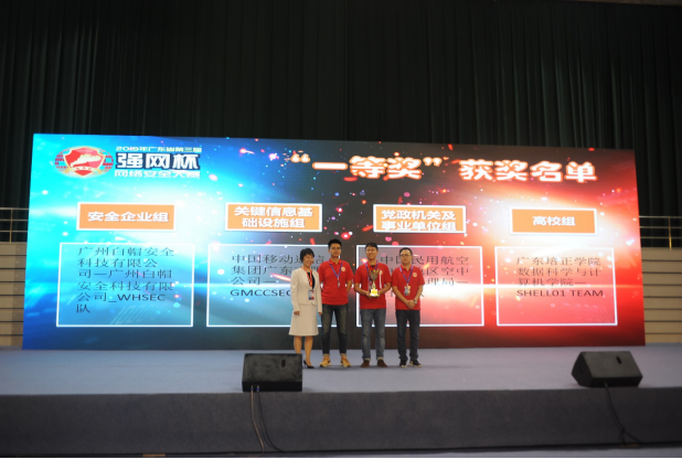 经过一天紧张激烈的比赛,各组分别决出一等奖1名、二等奖2名、三等奖3名。中国民用航空中南地区空中交通管理局、广东培正学院数据科学与计算机学院、中国移动通信集团广东有限公司、广州白帽安全科技有限公司分获党政机关及事业单位组、高等院校组、关键信息基础设施运营企业组、网络安全企业组第一名。赛后,大赛主办、承办、协办单位的领导以及网络安全行业嘉宾为各获奖队伍颁发奖杯和证书。获奖队伍参赛人员还将获得中国信息安全测评中心颁发的相应国家级信息安全从业人员资质认证证书。随着大赛决出胜负,第六届广东省网络安全宣传周也宣告落下帷幕。